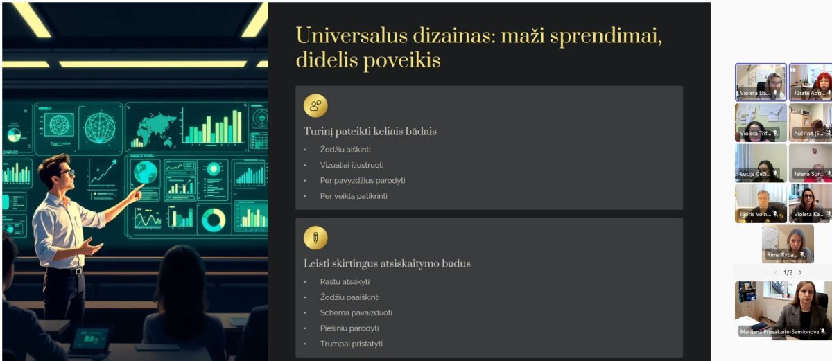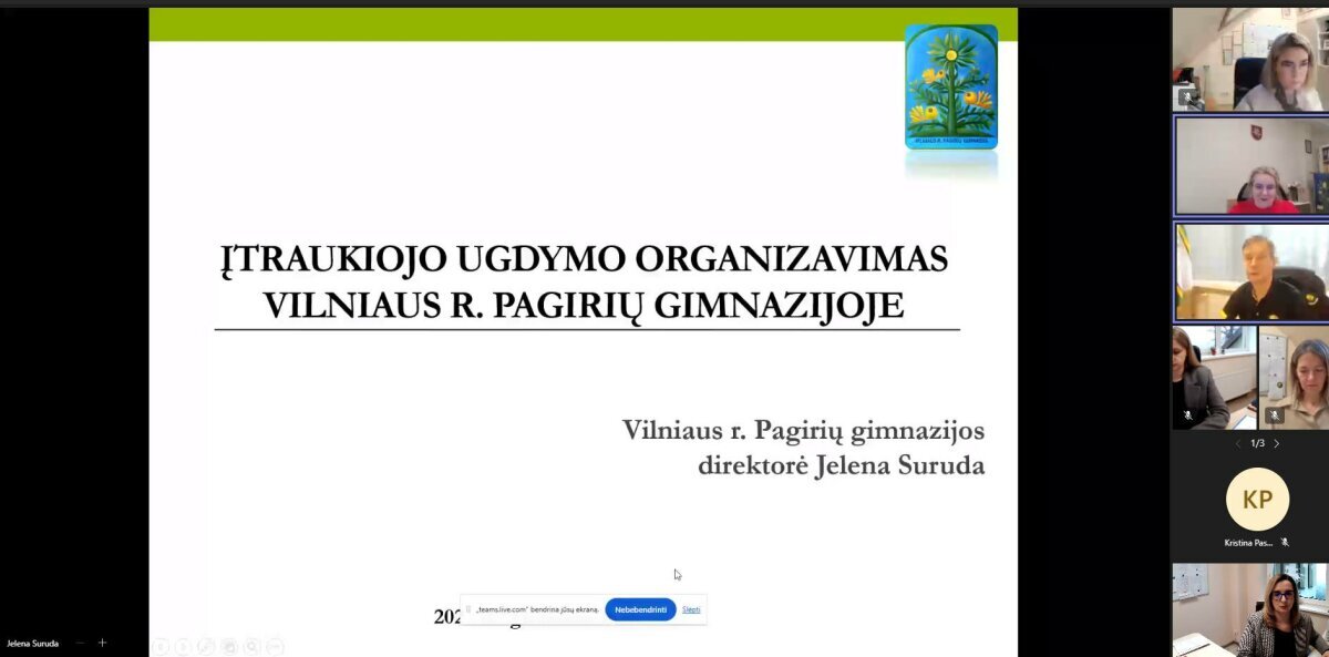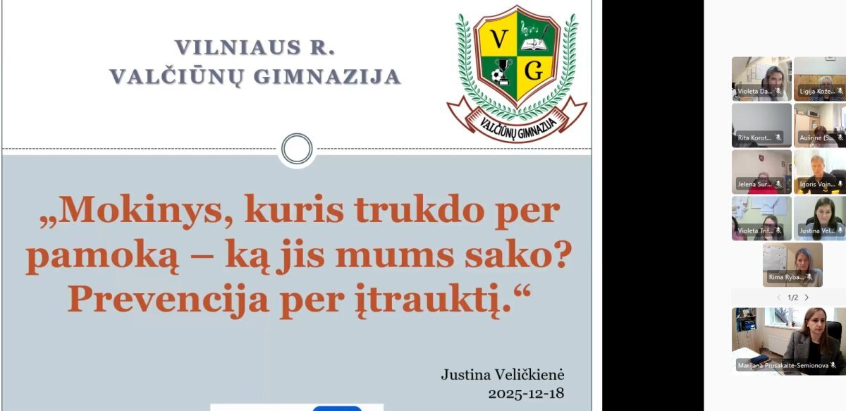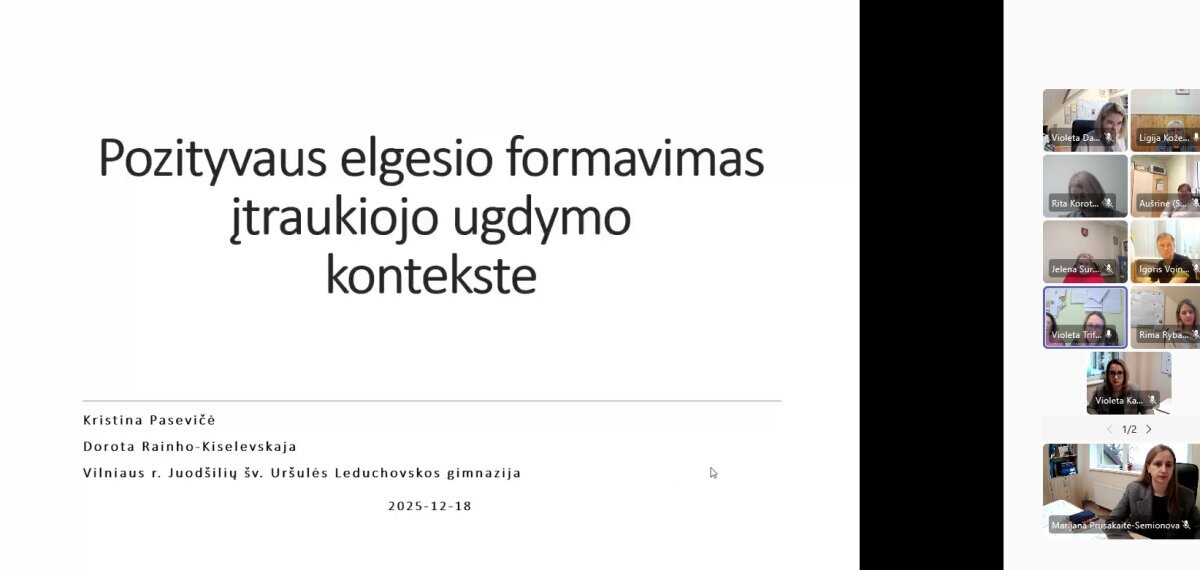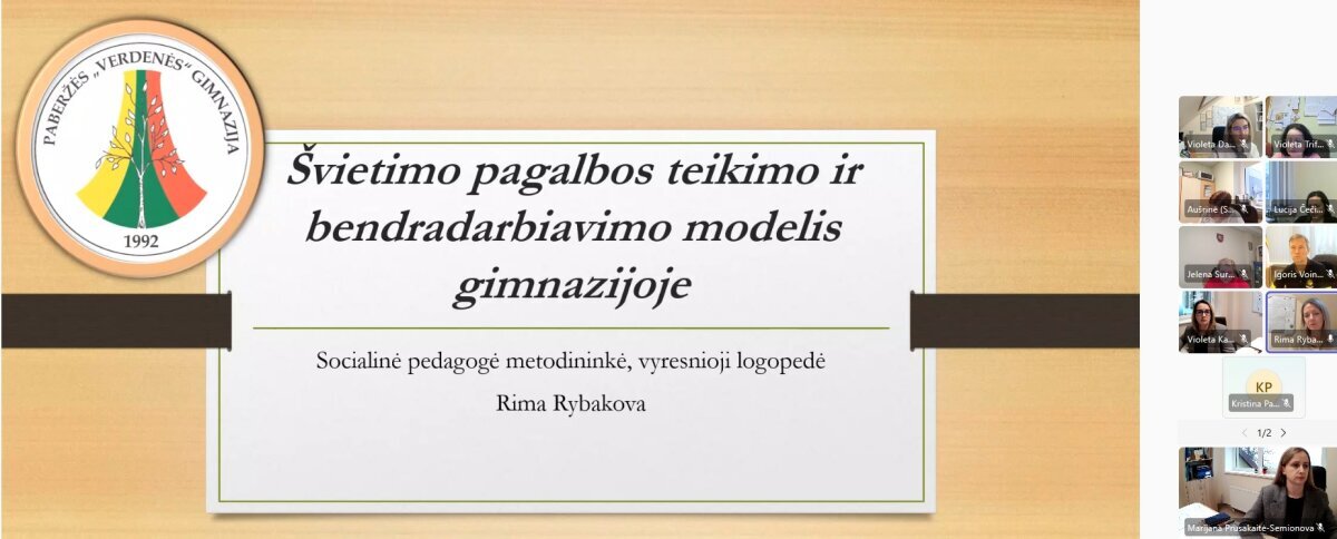 Gruodžio 18 dieną vyko nuotolinė gerosios patirties sklaidos sesija, subūrusi vadovus, pedagogus ir švietimo pagalbos specialistus iš bendradarbiaujančių mokyklų. Susitikimo metu dalyviai pristatė savo gimnazijų patirtis: aptarė įtraukiojo ugdymo organizavimą, skirtingų gebėjimų mokinių įtrauktį į bendras veiklas, pozityvaus elgesio formavimo praktikas, universalaus dizaino taikymą pamokose bei bendradarbiavimo modelius.