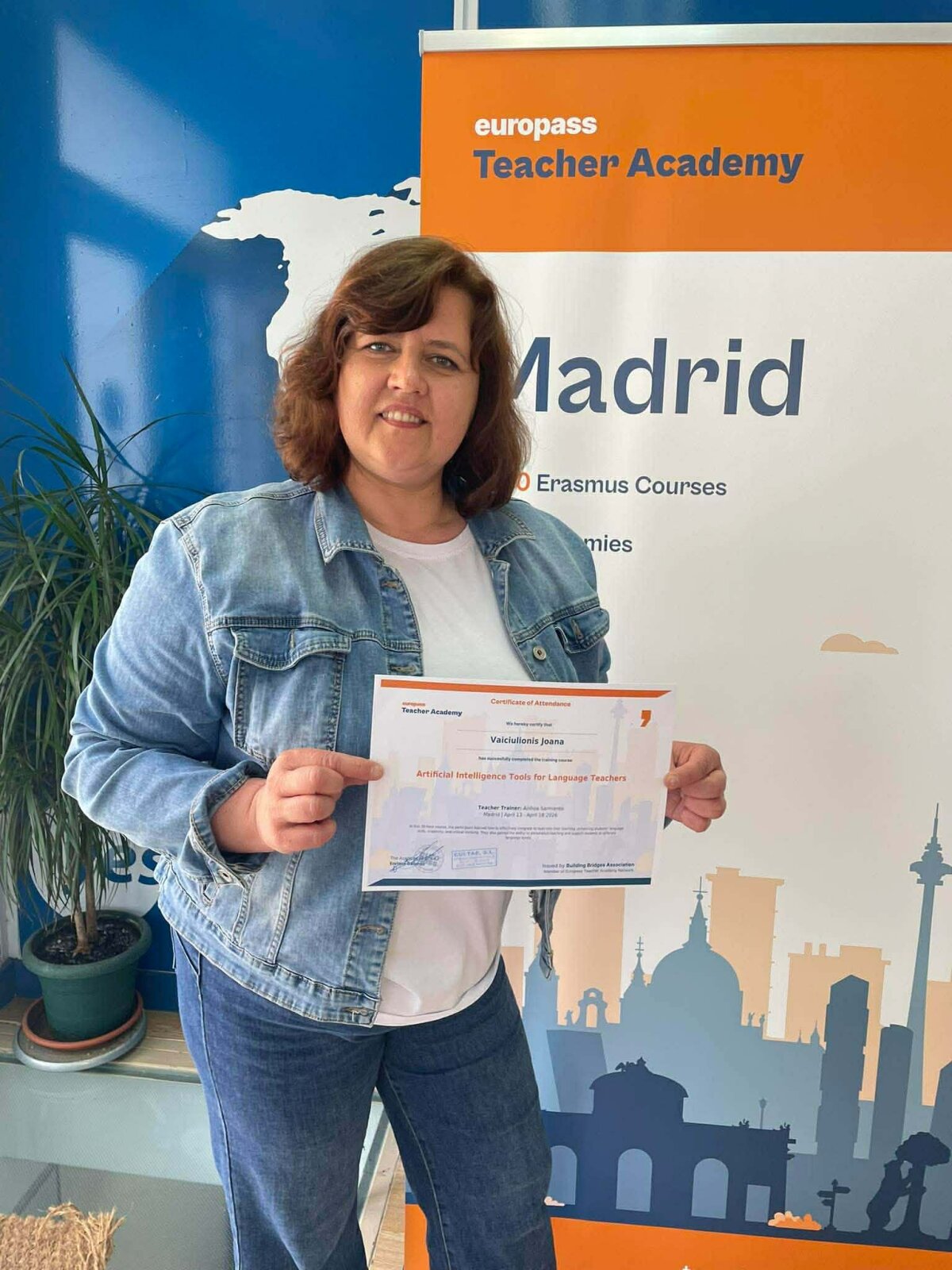 Anglų kalbos mokytoja Joana Vaiciulionis profesinę patirtį gilino Madride vykusiuose kursuose „Artificial Intelligence Tools for Language Teachers“ (liet. Dirbtinio intelekto įrankiai kalbų mokytojams). Pagrindinis mokytojos tikslas – atrasti naujų, įdomių ir inovatyvių būdų, kaip dar labiau paįvairinti anglų kalbos pamokas bei sudominti šiuolaikinę jaunąją kartą.