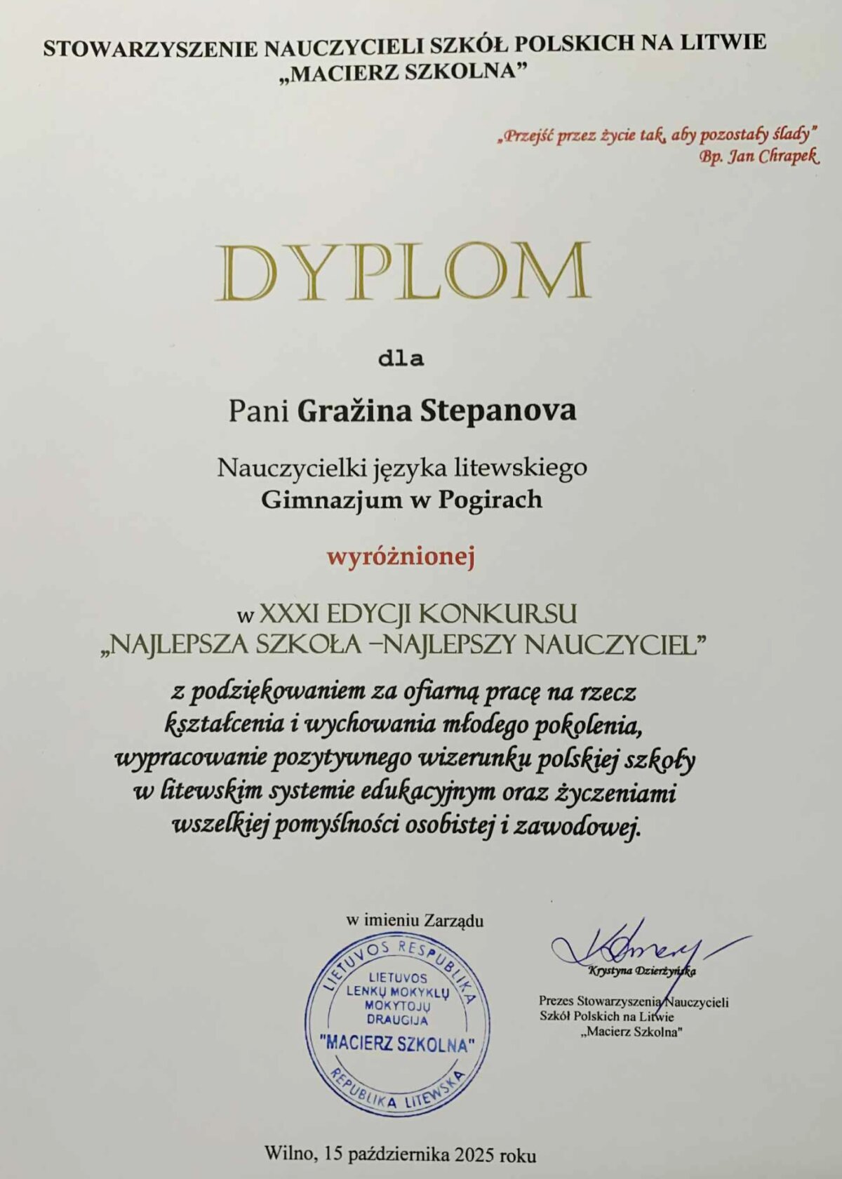 Spalio 15 d. Lenkų kultūros namuose Vilniuje vyko iškilmingas XXXI konkurso „Geriausia mokykla- geriausias mokytojas“ apdovanojimų renginys, kurį organizuoja Lietuvos lenkų mokyklų mokytojų draugija „Macierz Szkolna“.